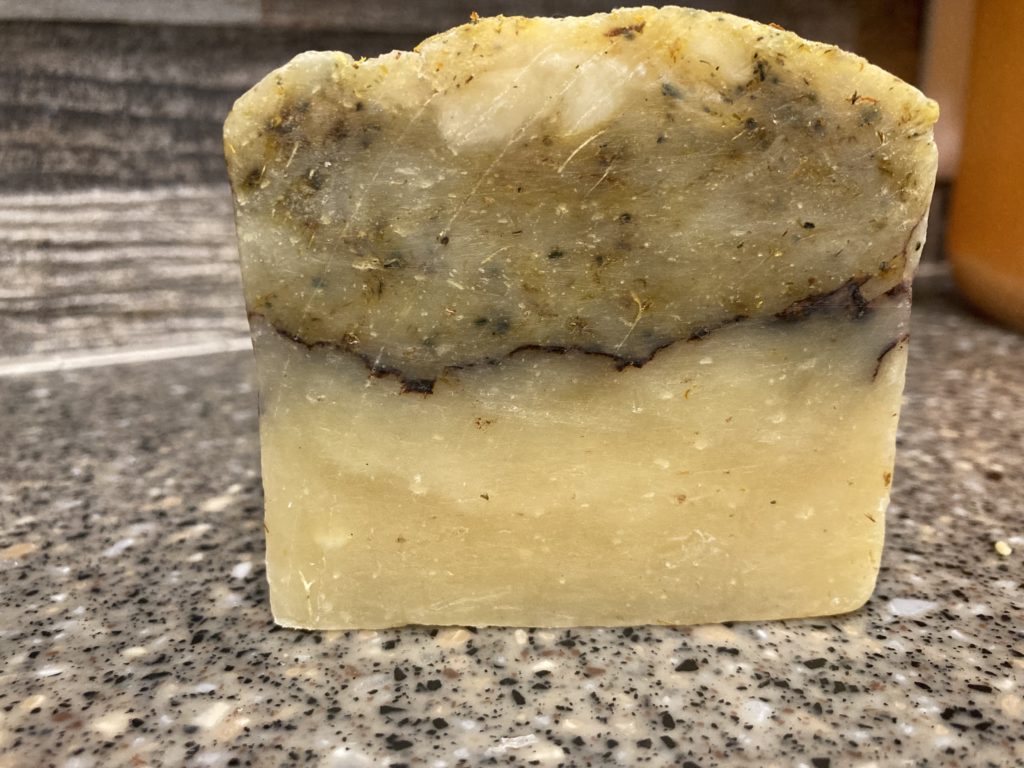 This soap is sweet, and has lots of calendula, both infused in oils, and ground flowers added to the soap itself. It’s a hot process soap that has excellent lather, and feels silky smooth on the skin. Calendula is a plant that is known for skin conditioning properties, and we grow several varieties here at the farm. We harvest all through the summer and dry flowers for use in soaps, lotions, and salves.