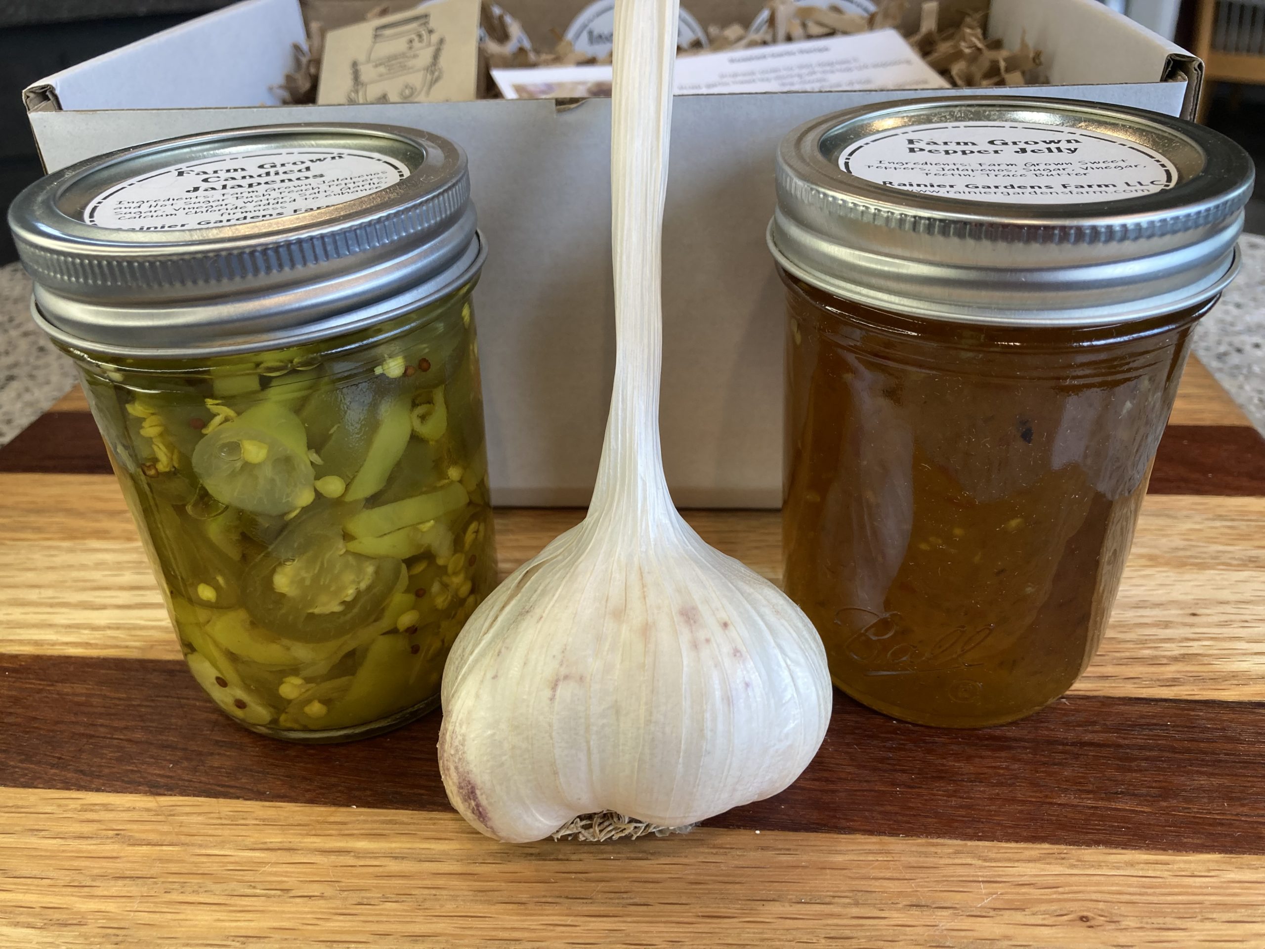 Two 8 ounce jars of peppers, one is Jalapeño Pepper Jelly and the other jar is Candied Jalapeños. Sweet heat both with spread and pickles to make a great addition to any special charcuterie board.