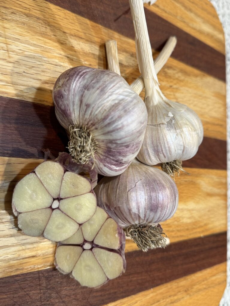 Vekan Garlic is a glazed hard neck garlic. It originates from the Czech Republic and is also sometimes called Vekak. Medium to large sized bulbs with great yield. 8-12 cloves per bulb. It’s a good storing garlic for a hard neck, and also mid-season producer. Average is 6-8 bulbs per pound. We love this garlic as it is beautiful, purple skins, and the flavor is mild enough for fresh use, but also stands up well to roast. A great all-around garlic for sure!